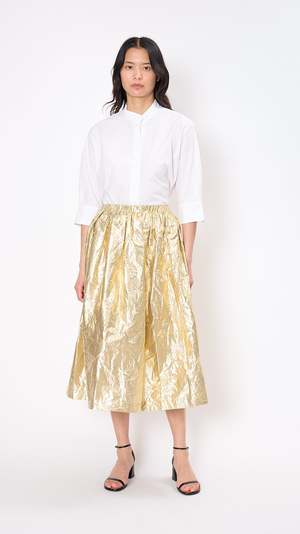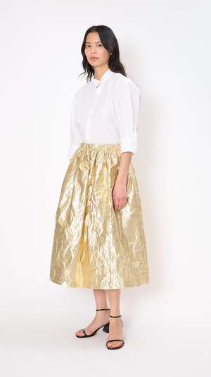 Sara Lanzi Gathered Skirt in Gold The Gathered Skirt features an elasticated waist, side seam pockets, midi length, and a voluminous, A-line silhouette. Crafted in a metallic gold poly blend. Materials: 67% Polyamide, 33% Polyester. Care Instructions: Machine Wash Made in Italy About Sara Lanzi: Launched in 2005 by the brand's namesake, Perugia-based Sara Lanzi features elevated basics in modern, feminine silhouettes. You will find effortlessly simple, elegant pieces with a touch of avant-garde, designed and crafted in Italy.