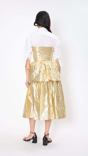 Sara Lanzi Ruffled Top in Gold The Ruffled Top features a strapless cut with side zip closure and a peplum waistline with pleated detailing. Crafted in a metallic gold poly-blend. Materials: 67% Polyamide, 33% Polyester Care Instructions: Machine Wash Made in Italy About Sara Lanzi: Launched in 2005 by the brands namesake, Perugia-based Sara Lanzi features elevated basics in modern, feminine silhouettes. You will find effortlessly simple, elegant pieces with a touch of the avant-garde, designed and crafted in Italy.