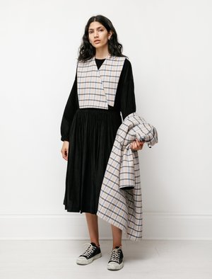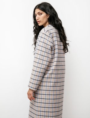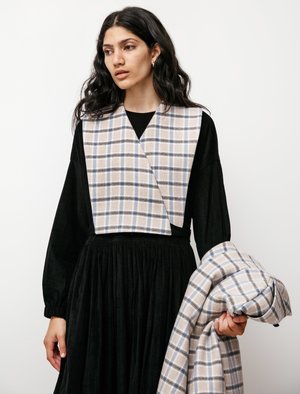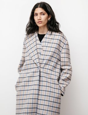 Elegance and ease all wrapped up in one, this coat from Sara Lanzi is cut from soft wool displaying a classic check pattern of beige, sky blue and dark grey. A tonal shawl is one of many uncharacteristic details that gives us all the more reason to love this coat, held in place by black ribbons; it serves as the perfect added layer for windy winter days. Its plunging v-neckline is framed by an asymmetric shawl collar and double button closure, this coat is unlined and finished with black piping seam binding. - Made in Italy - 80% wool, 20% nylon - Dry clean only - Fits true to size - Jiya is 59; bust 33; waist 24; hips 35; wears a size small