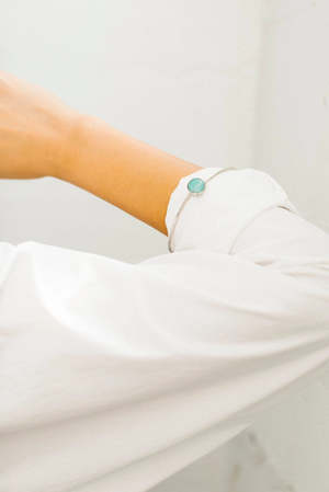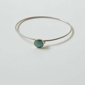 Simple bangle with round token. The end of the bangle loops under the stone setting making it easy to put on but very secure. - Sterling silver - Turquoise from Mexico - Length: 6" - Hand cut and sourced from small rock shops, collectsors and directly from family owned mines.