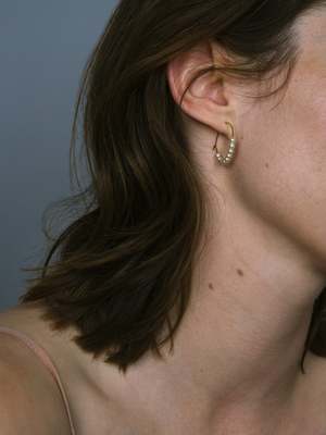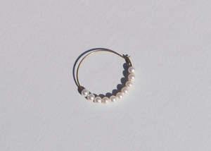 10 little freshwater pearls lined up on a delicate hoop made out of golden wire. For pierced ears. One single piece. Material is 18karat rose gold in combination with freshwater pearls.