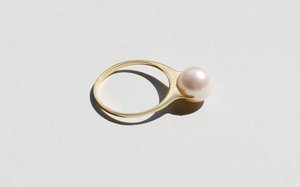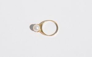 18 karat gold solitaire ring with a single freshwater pearl. Handmade in Munich. Saskia Diez is a Munich based goldsmith and jewelry designer. She produces her pieces with a handful of goldsmiths in Munich and Pforzheim, a town in Germany renowned for its jewelry making and nicknamed The Golden City. Trained in industrial design, Diez applies her knowledge of form, function and physical ergonomics to create delicate, intricate and chic pieces, mainly made of recycled gold and silver.