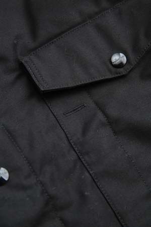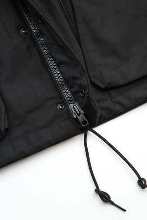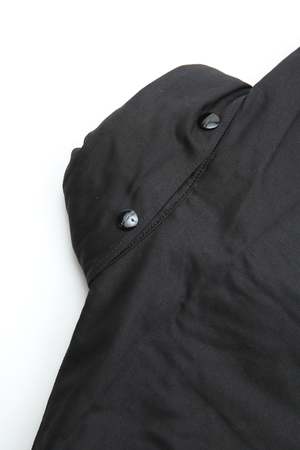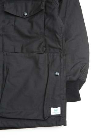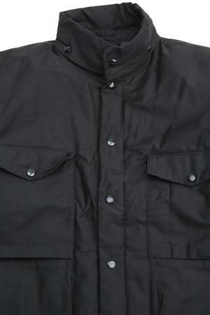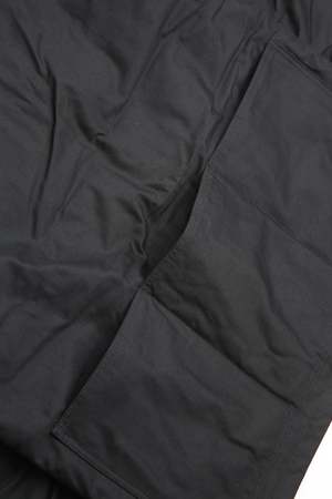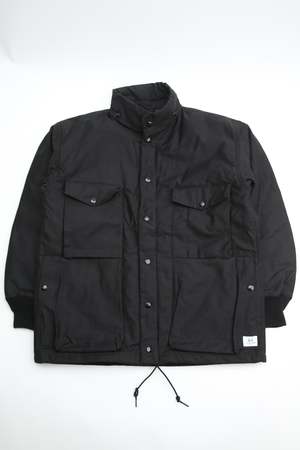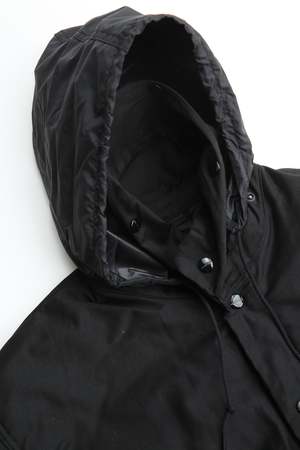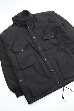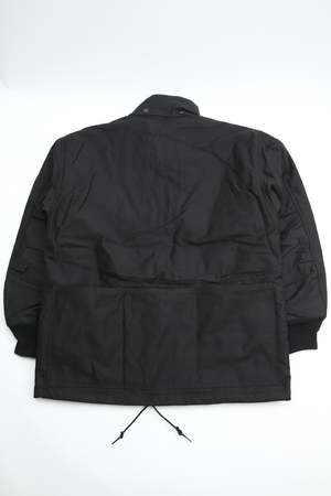 A new insulated jacket made from back satin fabric, based on the classic M-65 field jacket. The collar is a stand-up style with a hidden stowable hood. There are pockets on the left and right front with two compartments each, accessible from the top and the side. A large pocket with three compartments is placed on the back. The cuffs are ribbed and padded for additional warmth. The jacket fits wide to allow for extra layers to be worn underneath. Outer Fabric: 100% Cotton (Back Satin) Lining/Insulation: 100% Polyester Made in Japan Size Measurements (SXL) S: Chest 23 in, Length 30 in, Shoulder 21.5 in, Arm Length 24 in M: Chest 23 in, Length 31 in, Shoulder 22 in, Arm Length 24 in L: Chest 25.5 in, Length 31.25 in, Shoulder 23 in, Arm Length 25 in XL: Chest 26.5 in, Length 32 in, Shoulder 23.5 in, Arm Length 25 in.