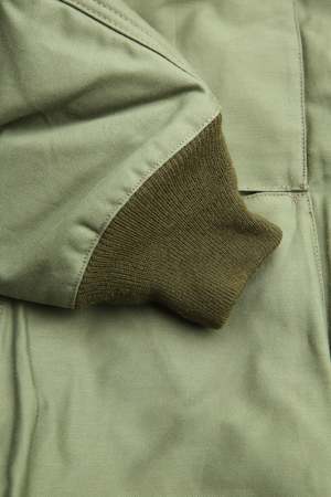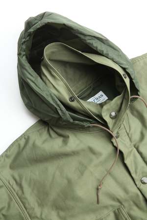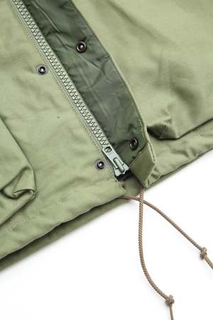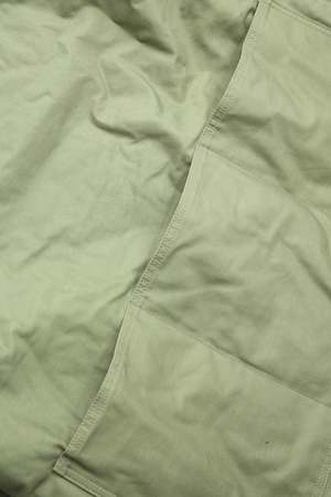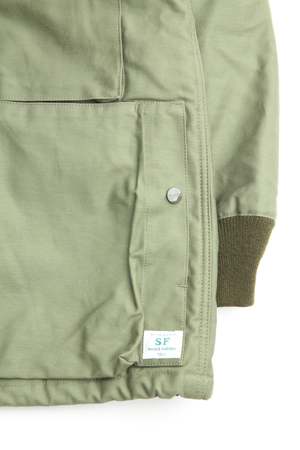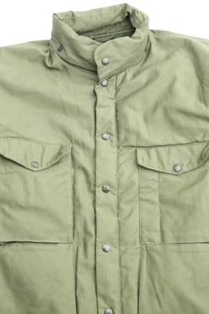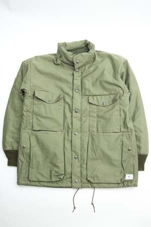 A new insulated jacket made from back satin fabric, based on the classic M-65 field jacket. The collar is a stand-up style with a hidden hood stow. There are pockets on the left and right front that have two compartments which can be accessed from the top or the side. There is also a large pocket with three compartments on the back. The cuffs are ribbed and filled with padding for warmth. The jacket fits wide to allow for additional layers to be worn underneath. Outer Fabric: 100% Cotton (Back Satin) Lining/Insulation: 100% Polyester Made in Japan. Sizing (S, M, L, XL): Chest: 23 in, 23 in, 25.5 in, 26.5 in Length: 30 in, 31 in, 31.25 in, 32 in Shoulder: 21.5 in, 22 in, 23 in, 23.5 in Arm Length: 24 in, 24 in, 25 in, 25 in.