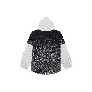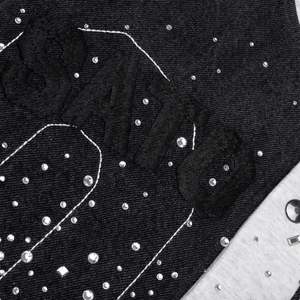 The Shattered Glass Knapp Ranch Hoodie by Satoshi Nakamsoto combines rugged utility with refined, luxury craftsmanship. Made from 100% heavyweight cotton, this statement piece features a fixed hood with drawstrings and a snap button closure for a structured silhouette. The design is elevated with glass rhinestone appliqu across the front and back, creating a shattered-glass effect that catches the light with every movement. Lettering appliqu and contrast stitching add depth and character, blending durability with bold visual impact. Goat SKU: FW25HO008.