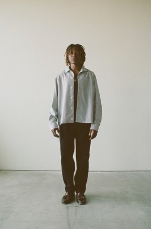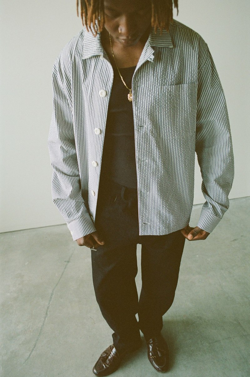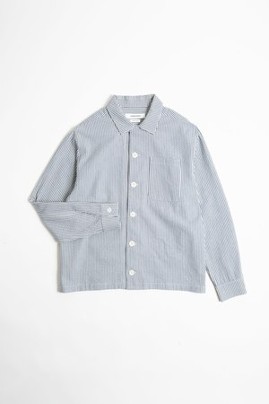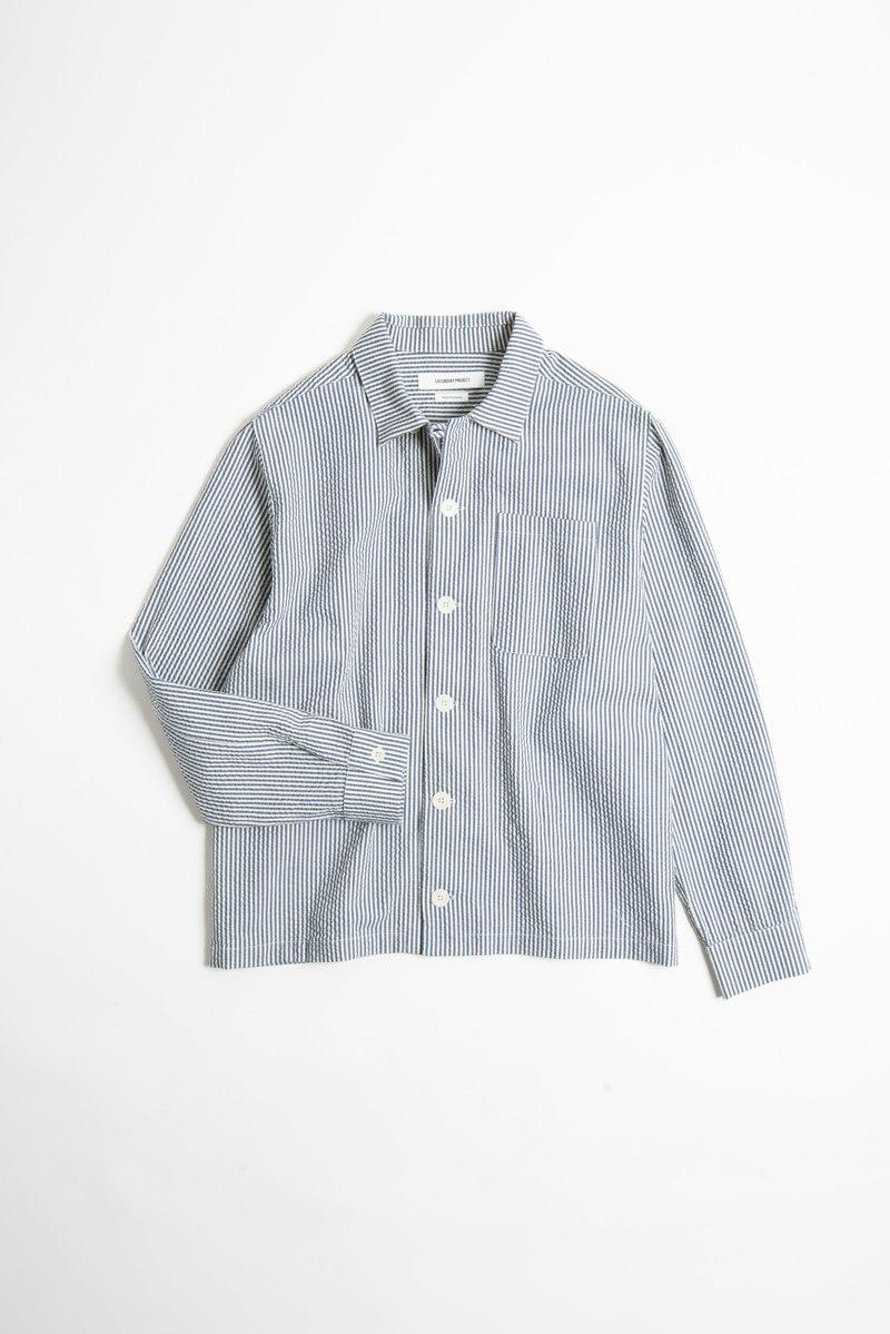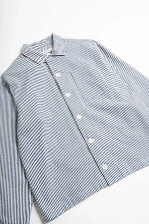 A versatile, slightly relaxed fitting long-sleeve shirt cut from a striped Japanese cotton seersucker in a soft blue and off-white palette. The texture comes from the warp threads being fed through the loom faster than the weft threads. The fabrics natural puckering lifts it subtly off the skin, creating greater air circulation, which makes for a perfect warm weather shirt or transitional layering. 100% cotton seersucker (woven in Japan) Oversized corozo buttons Single patch chest pocket Adjustable pleated cuffs Straight hem for easy wear tucked or untucked Made in Canada Cut, sewn, and finished in Vancouver, Canada. Fit Note: This garment fits true to size and slightly relaxed. If youre in between sizes, we recommend taking the smaller of the two for a standard fit, or if you prefer a relaxed fit, take the larger.