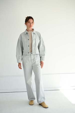 SAYAKA DAVIS straight-leg denim features a low-rise design with dropped inseam and a slightly voluminous straight-leg silhouette for a relaxed vibe. Straight-line side pockets and an adjustable waist belt at the back are key details. Made with 100% organic cotton sourced from Turkey, this 14.5-ounce color denim retains the classic weight of denim while offering a soft feel. The subtle Ice Gray hue serves as a fresh neutral color that blends beautifully into the autumn/winter palette. Details: - Front zipper and button opening - Adjustable waist belt at back - Front and back pockets - 14.5-ounce organic cotton denim - Made in Japan Sustainability: Organic cotton is grown without synthetic pesticides or fertilizers, using 91% less water, 62% less energy, and reducing greenhouse gas emissions by 46%. This sustainable choice supports healthier soil, water conservation, and biodiversity. Model is 59 / 175cm tall and wears a size S. Size Guide (inches): XS: Waist 14 1/4, Hip 19 1/4, Side length 40, Rise 10 1/4 S: Waist 15 1/4, Hip 20, Side length 40 1/2, Rise 10 1/2 M: Waist 16, Hip 20 3/4, Side length 41 1/4, Rise 10 3/4 L: Waist 16 3/4, Hip 21 3/4, Side length 42, Rise 11