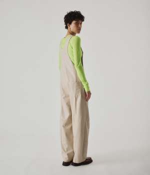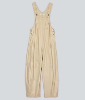 Vegan leather coverall. A casual item in a vegan leather material with an elegant look. This season, our classic pants have been updated with a barrel silhouette. Adjustable strap length with buttons. Wear with a T-shirt at the beginning of Fall or with a sweater in Winter. You can enjoy styling this item season after season.