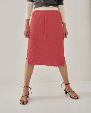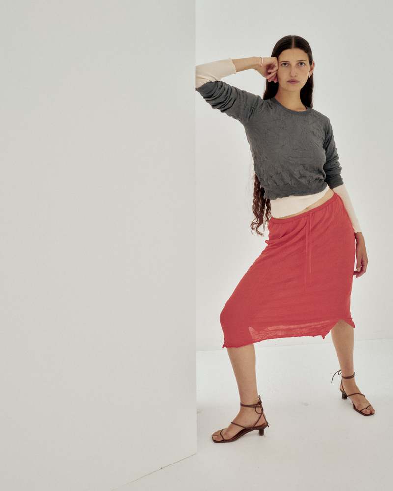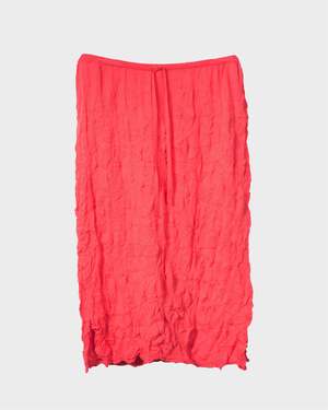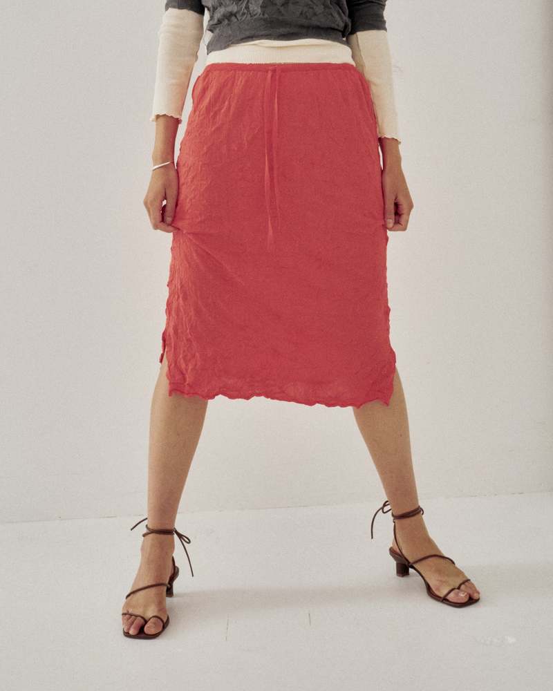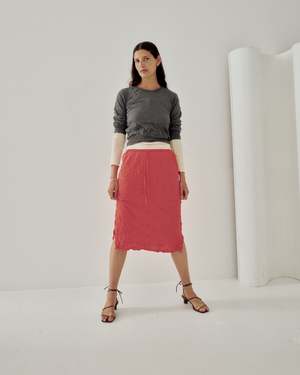 This item is available for pre-order and will ship by March 27. A new skirt silhouette in SAYAKA DAVIS NEW YORK's signature crinkled knit. While it pairs beautifully with the matching top for a coordinated set, it can also be styled with an oversized shirt for a relaxed look. The simple design is enriched by the fabrics distinctive crinkled texture, while the hem is finished with a knit-specific rolled edge that adds light, effortless movement. SAYAKA DAVIS continues to explore the crinkled knit series season after season. The yarn blends organic cotton with recycled polyester, creating a cool, breathable touch. Knit with a slightly open gauge, the fabric has a subtle sheerness and airy texture. A catch-washer finishing process introduces unique dimensional wrinkles and irregularities, giving the material its distinctive character. Composition: 53% organic cotton, 47% recycled polyester. Made in Japan. Care: Hand wash cold. Lay flat to dry. Sizing (inches) XS-S / M / L Waist: 14.3 / 15.0 / 15.8 Hip: 21.5 / 21.8 / 22.0 Side length: 21.0 / 21.5 / 21.8 Inleg: 23.3 / 24.0 / 24.8 Hem: 23.3 / 24.0 / 24.8