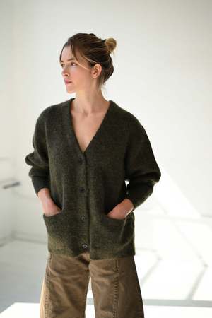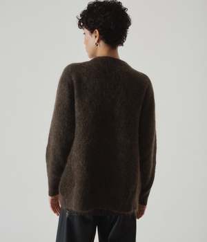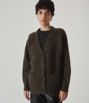 New V-neck cardigan from SAYAKA DAVIS's signature mohair series. This season, it has been updated to a boxy silhouette with an oversized, loose-fitting hem for genderless wear. Lightweight, soft, and warm, this material is also resistant to pilling, making it a comfortable piece that you will find yourself reaching for. Whether worn alone or layered with a shirt, this everyday piece blends well with a variety of styling options.