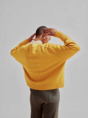 A V-neck cardigan featuring sculpted balloon sleeves and elongated cuffs. The relaxed boxy body and slightly cropped length create a balanced silhouette that pairs effortlessly with midi skirts, straight-leg, and barrel-leg trousers. Knitted in jersey stitch using multiple strands of 19.5-micron mulesing-free fine merino wool, this fabric has a plush, voluminous finish. The multi-strand construction enhances durability, minimizing pilling while offering a subtle sheen and a clean, refined look. Mulesing-free wool is produced without the harmful practice of mulesing, where skin is removed from a sheeps tail. This humane approach ensures ethical sourcing, making the wool more sustainable and cruelty-free. 100% Wool (Mulesing-Free) Made in China Sizing table: Size (Inch) : XS-S : M Length: 22 : 22 3/4 Shoulder: 17 1/4 : 18 Bust: 23 : 24 Hem: 21 3/4 : 22 3/4 Sleeve Length: 31 3/4 : 32 3/4 The model is 59.5 / 177cm tall, wears a size S.