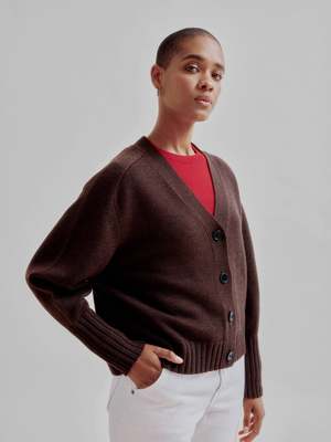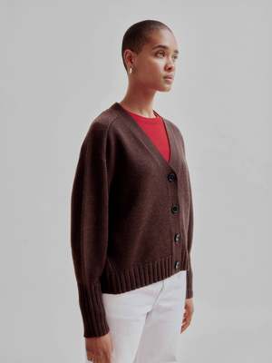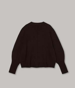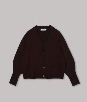 A V-neck cardigan featuring sculpted balloon sleeves and elongated cuffs. The relaxed boxy body and slightly cropped length create a balanced silhouette that pairs effortlessly with midi skirts, straight-leg, and barrel-leg trousers. Knitted in jersey stitch using multiple strands of 19.5-micron mulesing-free fine merino wool, this fabric has a plush, voluminous finish. The multi-strand construction enhances durability, minimizing pilling while offering a subtle sheen and a clean, refined look. Mulesing-free wool is produced without the harmful practice of mulesing, where skin is removed from a sheeps tail. This humane approach ensures ethical sourcing, making the wool more sustainable and cruelty-free. 100% Wool (Mulesing-Free) Made in China.