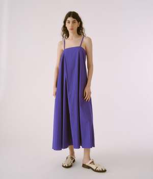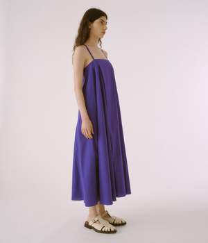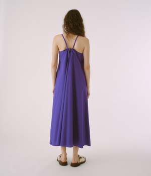 Strappy dress in organic cotton poplin. Asymmetrical drapes, adjustable ribbon at the back.