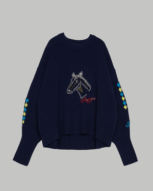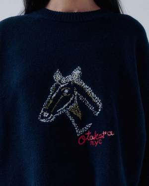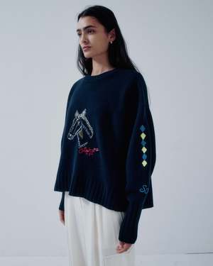 FIRE HORSE EMBROIDERY OTAKARA NYC SAYAKA DAVIS This cropped balloon-sleeve pullover is shaped through knitting to create a soft, three-dimensional form. Extended ribbed cuffs draw the sleeves inward, while the oversized body and curved hem add movement and character to the silhouette. The cropped length offers a modern balance, making this knit both sculptural and wearable. This special piece features Fire Horse embroidery, hand-stitched by OTAKARA NYC, by New Yorkbased artist Satoshi Suzuki. Each motif begins as a hand-drawn sketch and is embroidered individually, giving every piece its own character. The Fire Horse references 2026 the Year of the Fire Horse (Hinoe-uma) in the East Asian zodiac calendar. Appearing only once every 60 years, it symbolizes strength, independence, and forward movement, serving as a quiet talisman rather than decoration. Produced in four colors, seven pieces total. This piece will not be remade. Description Slip on Detail RWS-certified wool and cashmere blend yarn, with a soft hand feel, knitted in a classic jersey stitch. Fabric: 100% Wool (RWS certified) Size Guide (Nude Size) Size S (inches): Length: 23 1/4 Shoulder: 22 3/4 Bust: 25 1/2 Hem: 24 3/4 Sleeve: 21 1/4