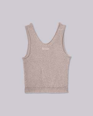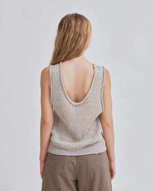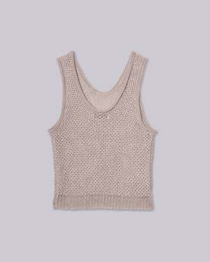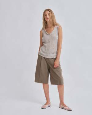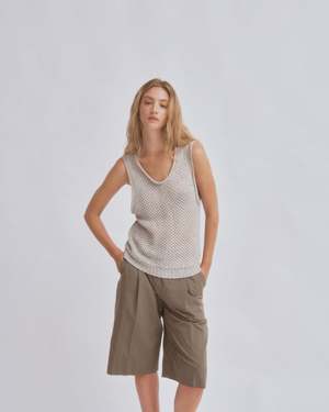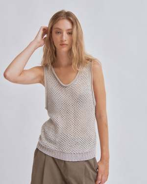 This linen knit tank features a tucked structure with a generous U-neck and bold cutouts at the sleeve cuffs for a stylish edge. Its versatile design pairs seamlessly with tucked shorts, acetate satin track pants, or a pull-on skirt, creating a fresh look that effortlessly blends sophistication with a relaxed vibe. This product is available to pre-order and will ship by 3/20.