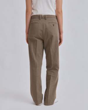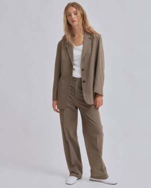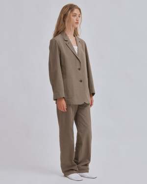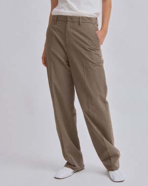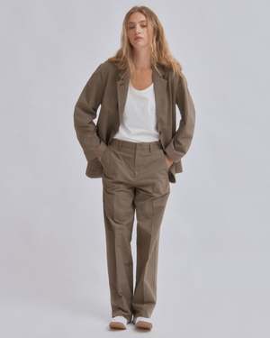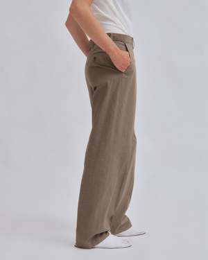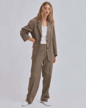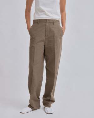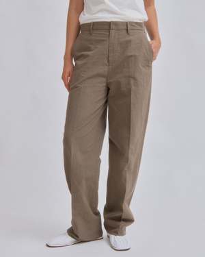 These straight-leg full-length trousers, inspired by the 90s, offer a stylish blend of mannish structure and relaxed ease. Featuring a low waist and dropped inseam, they create a clean, straight line from waist to hem, introducing a fresh, modern silhouette. Made from lightweight hemp cotton typewriter fabric with a natural crinkled texture, these trousers are perfect for achieving a contemporary business casual look. This product is available to pre-order and will ship by 3/20.