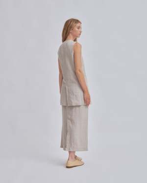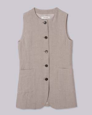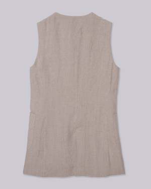 This long vest, inspired by 90s style, is crafted from natural linen material, offering versatility for both dressy and casual occasions. Its tailored design adds a fresh touch to your wardrobe, whether worn as a top or layered over a T-shirt or tank. Pair it with an I-line skirt and shorts for a business casual look, or with denim for a relaxed weeknight outfit. This product is available to pre-order and will ship by 3/20.