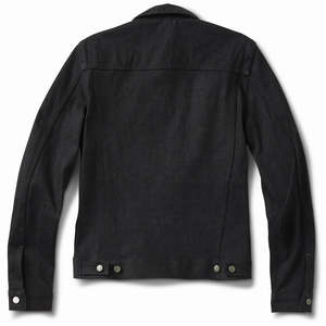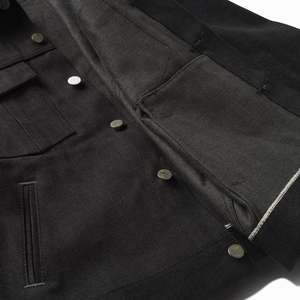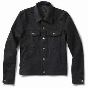 The Sulphur Black Denim Jacket from Schaeffer's Garment Hotel, Hollywood. Details Classic tailored fit six-pocket jacket with flat-felled seams 15oz black Japanese selvedge denim Aged acid-worn pewter black hardware with copper attachments Fit True to size with longer arms. Denim will be snug until broken in. For a looser fit, size up one.