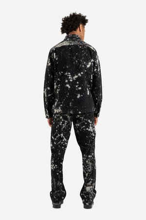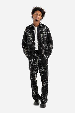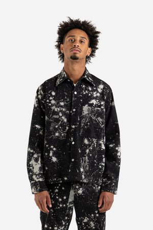 Schnayderman's Overshirt Workwear Sky in Dark Blue and Off White Schnaydermans are the overshirt dons for good reason, just take a look at the Overshirt Workwear Sky! This unlined cotton twill jacket is complete with all of Schnaydermans usual trimmingstwo large chest pockets, substantial metal buttons, and a lovely 70s-esque pointed collar. Of course, the main event is that all over print pattern, a white paint splatter that from a distance looks like a Hubble Telescope picture of the Milky Way. Wear them with the matching trousers to create the ultimate galactic power suit. Schnayderman's FW21 Collection