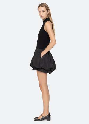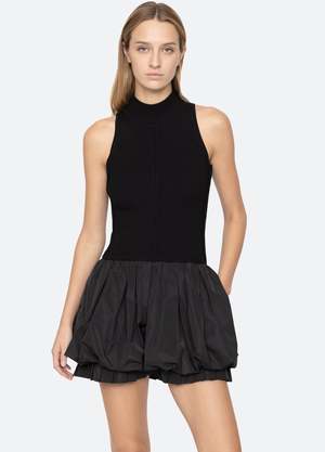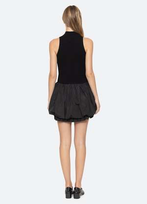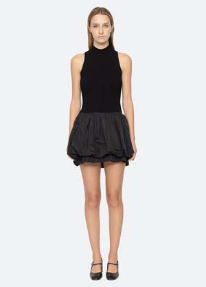 The Belen taffeta knit mini combo dress features a turtleneck and a bubble-hemline with ruffle detailing. Details: - self-100% wool - combo-100% polyester - slip on - designed for a slimmer fit - style #RS25-008 - model is 5'10'' and wearing a size S PRE-ORDER: EXPECTED DELIVERY 9/25-10/15