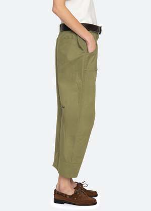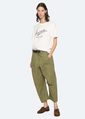The Andrea workwear pants feature a barrel-leg silhouette with a slightly cropped length. Pleats and a leather belt elevate the design, transforming classic workwear into a contemporary statement style. - 100% Cotton - Front zipper with hook and bar closure - Designed for a relaxed fit - The model is 5'10'' and wearing a size 4