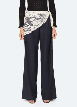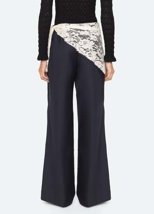 The Fiora tropical wool pants are tailored with a high-rise waist and a flattering wide-leg silhouette. An attached lace scarf drapes from the waist, adding a soft romantic contrast to the structured shape. Details: - Self: 70% wool, 30% polyester - Scarf: 100% polyamide - Invisible side zipper - Designed for a slimmer fit - Style #SS26-028 - Model is 5'10'' and wearing a size 4 PRE-ORDER: EXPECTED DELIVERY 1/25-3/5.