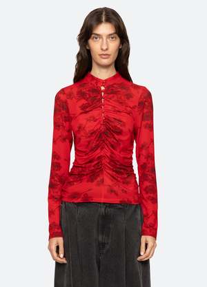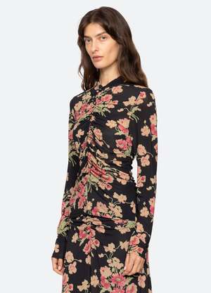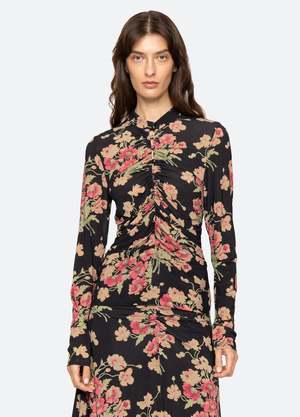 The Cornelia floral print long sleeve top is designed with a high neckline and detailed ruching along the front and back, creating a flattering, softly gathered silhouette. Its long sleeves and romantic print lend an effortlessly polished finish. Details: - 97% viscose, 3% elastane - Button front - Designed for a slimmer fit - Style #RS26-042 - Model is 5'10'' and wearing a size S PRE-ORDER: EXPECTED DELIVERY 10/15-11/15