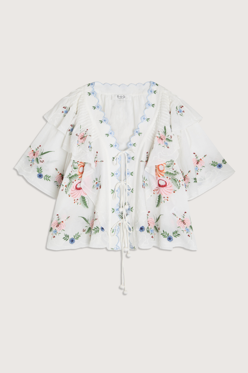 - Embroidered short sleeve top - Intricate floral embroidery throughout - Flattering V-neckline - Scalloped edges - Self-tie closures - Self: 55% viscose, 45% cotton - Embroidery: 100% viscose - Tie front closure - Designed for a relaxed fit - Model is 5'10'' and wearing a size S