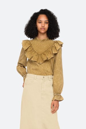 The Metta acid wash blouse features an oversized ruffle trimmed bib, long sleeves and high ruffle neck. Details: - 100% cotton - style #AW20-67 - model is 5'10'' and wearing a size S