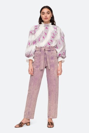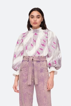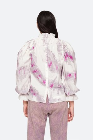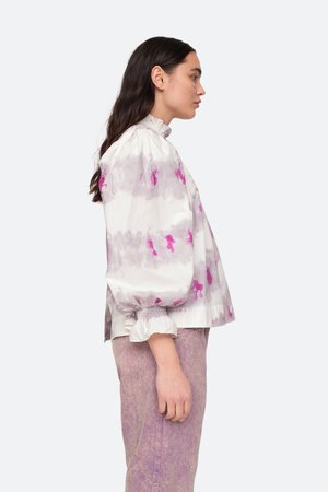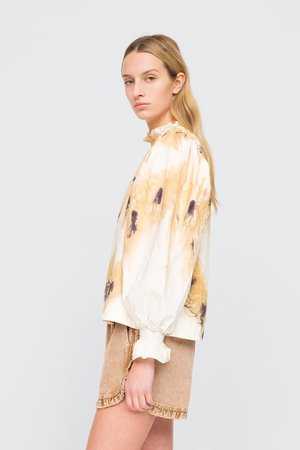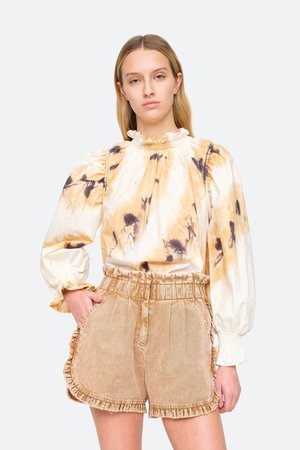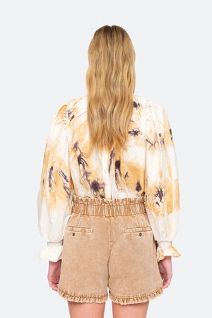 The Tamara tie dye long sleeve top features ruffle and smocked detailing at the neck and sleeves.Hand dyed by a women's collectsive in India.Please note when it comes to hand dyed garments, color variation is a normal part of the process. No two are exactly alike. Details: - 100% cotton - buttons at back - style #PF20-40 - model is 5'10'' and wearing a size S