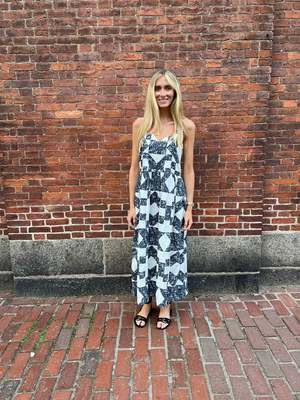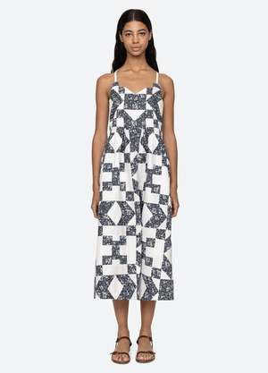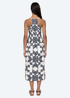 The Ana patchwork floral print slip dress features a geometric patchwork design, racerback, and midi silhouette. - Self: 100% cotton - Lining: 100% cotton - Invisible side zipper - Designed for a relaxed fit - Model is 5'10'' and wearing a size S