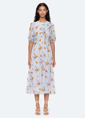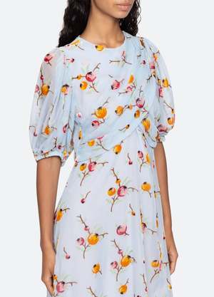 The Freya short sleeve dress is crafted from velvet burnout fabric with an all-over fruit pattern and features short puff sleeves for a feminine touch. Its midi silhouette and softly draped bodice create gentle movement and an effortlessly flattering shape. - Self: 80% Viscose, 20% Nylon - Lining: 100% Polyester - Invisible back zipper - Designed for a slimmer fit - The model is 5'10'' and wearing a size 4.