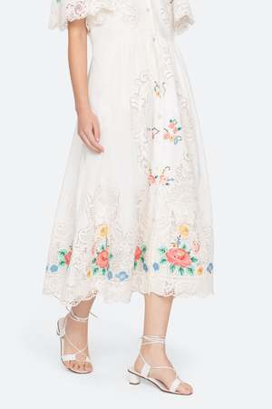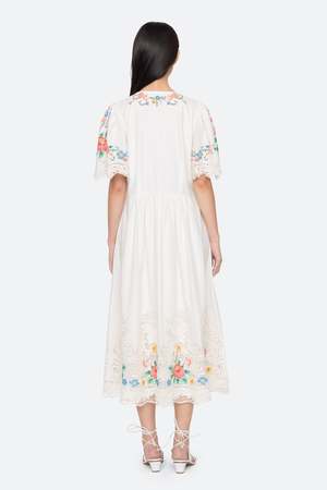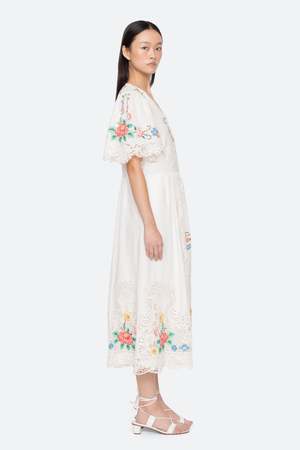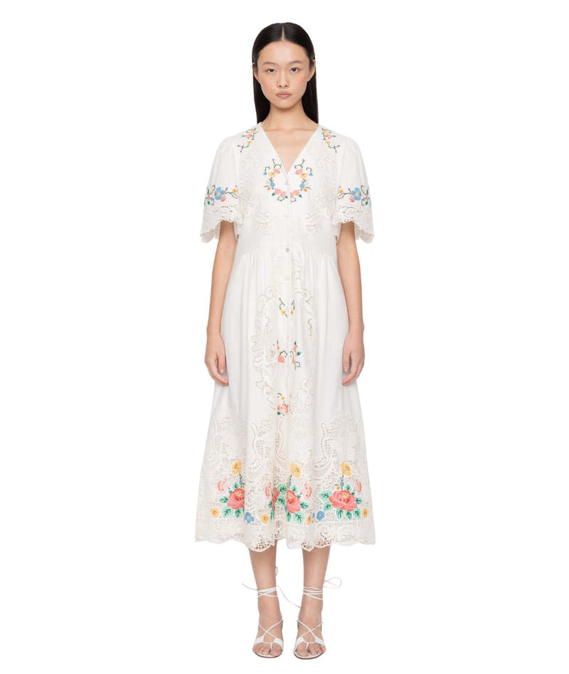 The Astrid embroidered short sleeve dress features a flattering midi silhouette and a V-neckline, complemented by short puff sleeves. Adorned with colorful floral motifs and intricate embroidery throughout, it exudes a cheerful, effortless charm. Details: - Self: 85% cotton, 15% linen - Lining: 100% cotton - Embroidery: 100% polyester - Button front - Designed for a relaxed fit - Style #SS26-058 - Model is 5'10'' and wearing a size S.