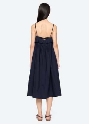 The Lois twill tank dress from Sea NY falls to a fluid midi silhouette and is detailed with a softly ruffled tier across the bodice. A self-tie accent at the back completes the design with a subtle, feminine finish. Details: - 100% cotton - Invisible back zipper - Designed for a relaxed fit - Style #SS26-088 - Model is 5'10" and wearing a size 4