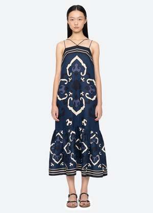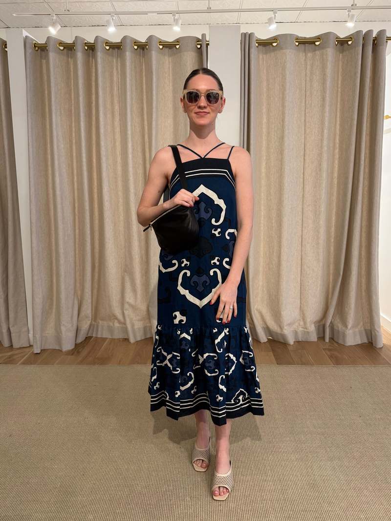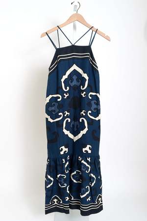 The Blaise geometric print dress features adjustable straps, a flattering midi silhouette, and a ruffled skirt for a playful, modern finish, perfectly balanced between effortless elegance and contemporary charm. 100% linen (lining 100% cotton) Model is wearing size Small.
