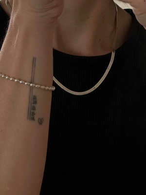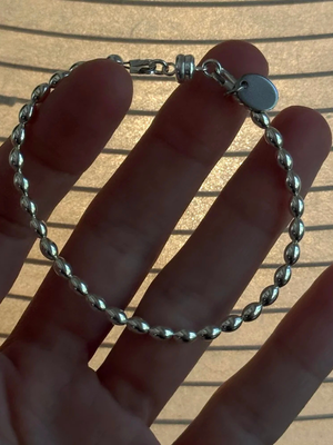A handmade sterling beaded bracelet. Materials: 5mm sterling silver oval beads. Wire cord with sterling silver hardware. Magnetic clasp designed for attaching with ease. Measures 7"