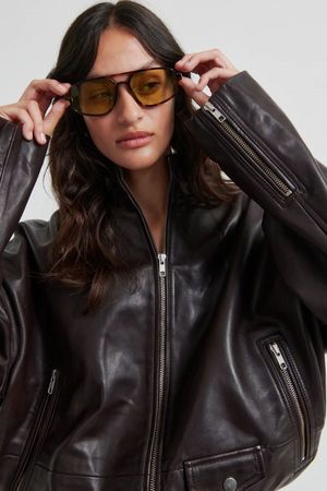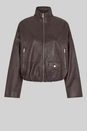 The Boston Leather Jacket from Second Female is a relaxed, cropped bomber-style jacket made of genuine lamb leather. It is fully lined and finished with an elasticated hem that creates a relaxed silhouette. DETAILS: - Fully lined - Elasticated hem creates relaxed silhouette - 100% lamb leather CARE: - Do not wash - Do not bleach - Do not tumble dry - Do not iron - Dry clean with PCE (gentle process) - Professional leather dry clean only SIZE + FIT: - Cropped, loose style - For more sizing details, please refer to the measurements in the size guide below.