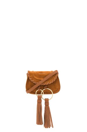 **This is a consignment piece** Suede exterior with canvas lining Flap top with magnetic button closure. Detachable adjustable strap. Interior slit pocket. Ring with fringed tassel accents. Measures approx 6.5" / 17 cm W x 4.5" / 11 cm H x 2" / 5 cm D. Revolve Style No. SEEB-WY247. Manufacturer Style No. CHS18 SS881330242.