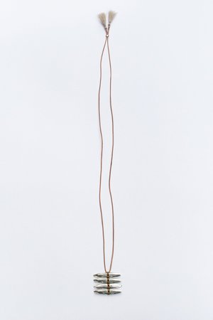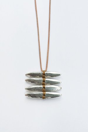 The sterling silver pieces used in this necklace were carved in wax, cast in Sterling silver, and polished to have the perfect amount of shine. Four pieces are then woven together with nylon thread to make the pendant, measuring 1.5 inches wide and 1 inch tall when finished. The metal is solid sterling silver, so the pendant has a nice weight to it. On a leather cord measuring 28 inches long and adjustable with a bead at the back. Finished with handmade tassels.