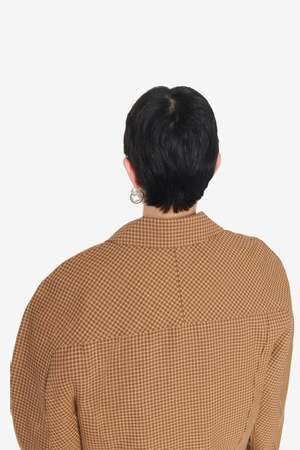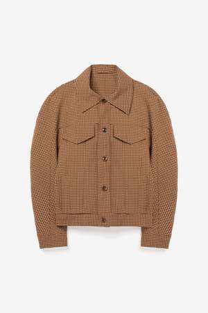 The Matthieu Jacket by Sfr is made from a light wool checked fabric from Italy. It features a curved shaped sleeve, spread collar, and two large front flap pockets. Style code: MFW25MATTHIEUFIN