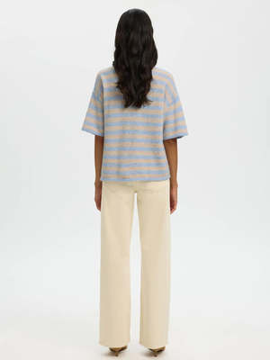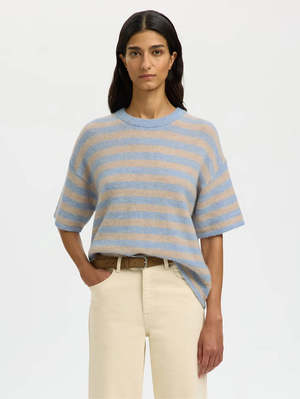 The Lulu Short Sleeve Sweater from Selected Femme is a wool-blend, knitted T-shirt with a boxy fit and short sleeves. - Knitted T-shirt - Round neck - Wide sleeves - Ribbed cuffs - Flat knit - Baby blue and beige stripe - 39% Wool, 24% Polyester, 20% Alpaca, 15% Nylon, 2% Elastane