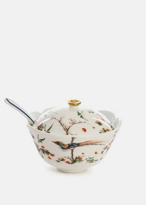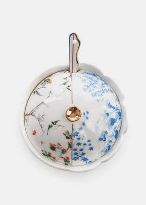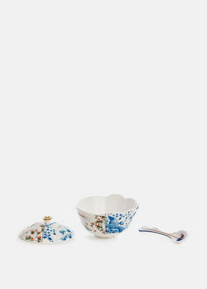 Porcelain Hybrid Maurilia sugar pot with spoon in white and multicolor. Gold-tone detailing. Measurement(cm): 12 diameter, 9 height. 100% Porcelain. Imported.