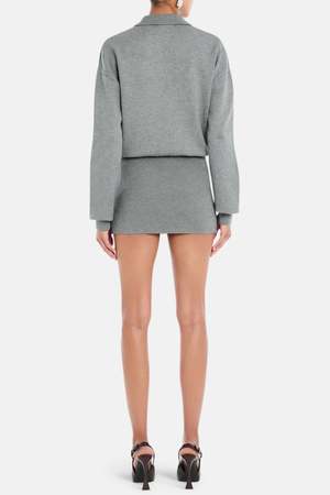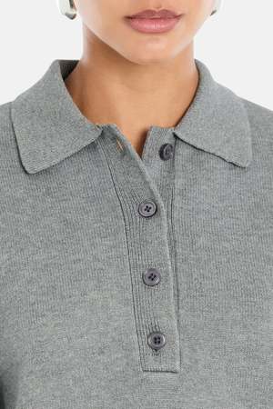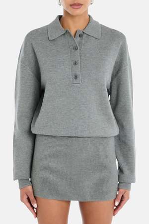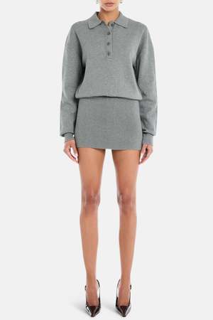 Long sleeve knit mini dress with a relaxed bodice and fitted skirt. Features a button-up neckline and collar. Shown here in Medium Grey. - Color: Medium Grey - 72% Viscose, 28% PBT - Made in China - Model is 5'10" wearing size S - Style No. S-FW25-5083-17