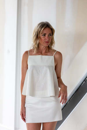 The Lana Linen Skirt by Ser.o.ya features a low rise and mini hem. This skirt is lined but is slightly sheer. Color: Eggshell Fabric: 55% Linen, 45% Cotton Fit Notes: True to size