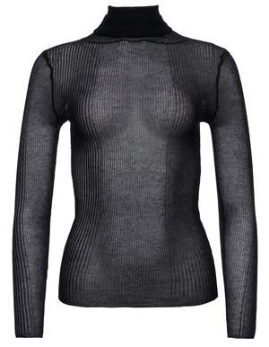 Lightweight long sleeve turtleneck sweater cut in sheer ribbed fabrication. 62% Viscose, 22% Polyester, 8% Linen, 8% Tencel.