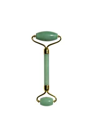 This dual-ended facial roller is crafted from natural jade stone and finished with gold-toned hardware. Use it to depuff, lift, and add a cooling moment of calm to your skincare routine. Use the larger end for cheeks and jaw, and the smaller end for eyes and temples. Pro tip: keep it in the fridge for an extra-refreshing morning glow. Details - Material: green aventurine (this roller); pink quartzite and purple amethyst used in other colorways - Weight: 66 g - Measurements: 6 cm x 14 cm x 1.5 cm Dual-ended jade face roller to depuff and lift. Use daily or chilled for a cooling skincare ritual that boosts glow and eases facial tension.
