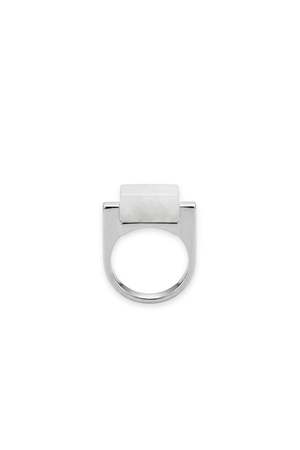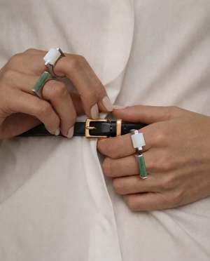 A modern take on classic equestrian design, this saddle ring features luminous Hanbai white jade set in platinum plated brass. Clean architectural lines meet quiet elegance, designed for effortless everyday statement wear. Material: Hanbai jade, platinum plated brass Weight: 7 g Bar: 9 mm x 12 mm Band thickness: 1.5 mm Band width: 4 mm Care guide: To keep your jade, pearl, and gold-plated jewelry in top condition, avoid impact, as jade is brittle and pearls are delicate. Remove jewelry before swimmingchemicals can cause damageand never shower with gold-plated pieces, as water can cause tarnishing. Avoid harsh cleaners like acids or alcohol; instead, use water or a mild soap solution to keep them looking their best. Year of the Horse white Hanbai jade saddle ring in platinum plated brass. Modern equestrian design with luminous stone and clean architectural lines.