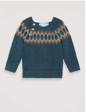 Our classic raglan sweater for baby in soft baby alpaca wool with Nordic inspired pattern. Knit in dark reef blue melange yarn with pattern in creme and soft brown. Opens with seashell buttons on left shoulder. Slim fit and wear lovely both in and out-door.