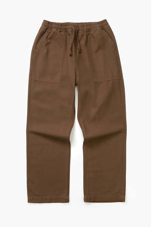 Relaxed, straight-leg pants with an adjustable waistband and drawstring. Features rear pockets with woven label and fatigue front pockets. Made from GOTS organic 360gsm (11oz) cotton canvas.