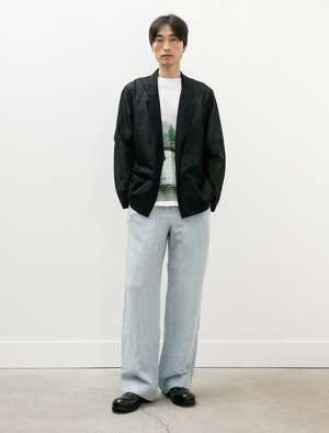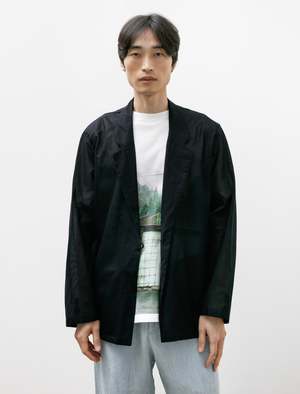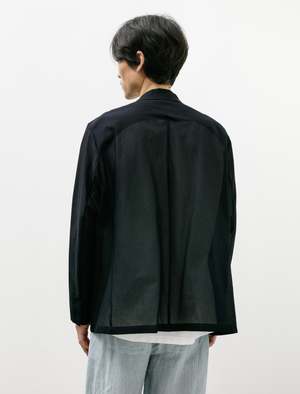 An easy, boxy, single-button blazer cut from a super lightweight cotton leno cloth in a deep navy. Features a narrow notch lapel with a low breakpoint, a looped button hole that conceals the closure, and on-seam hand pockets at the waist. The unique open weave structure of the leno cloth offers sheerness and breathability that are well suited to summer layering while the simple, minimal silhouette offers a sense of effortless elegance. Constructed using fine French seams throughout for a low profile, encased finish that leaves a tidy interior. Mother of Pearl button.